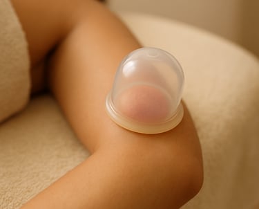 During a dry cupping session, glass, plastic, or silicone cups are placed on specific areas of the body. A vacuum is created inside the cup — either by heat (fire cupping) or a hand pump — gently drawing the skin upward. This increases blood flow to the area and helps relieve tightness.